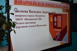 12 февраля 2026 года юнармеец отряда «Патриоты» Ивановской средней школы Болеева Василиса Анатольевна в соответствии с Приказом начальника главного штаба Всероссийского военно-патриотического общественного движения «ЮНАРМИЯ» № 165 от 01.12.2025 представлена к выдаче и награждению знаком «Юнармейская доблесть» II степени .